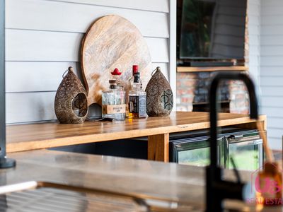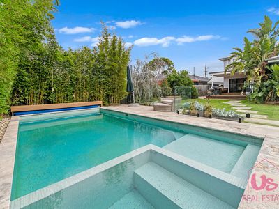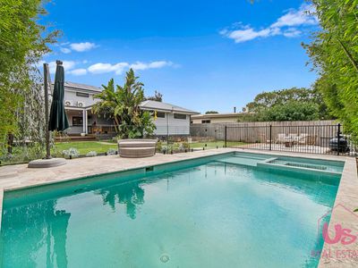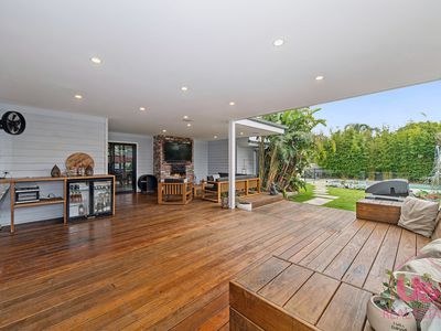 Step outside to a magnificent covered decked entertaining area complete with open fireplace, flowing seamlessly from the main living space and overlooking the saltwater in-ground pool with built-in spa — perfect for entertaining all year round.